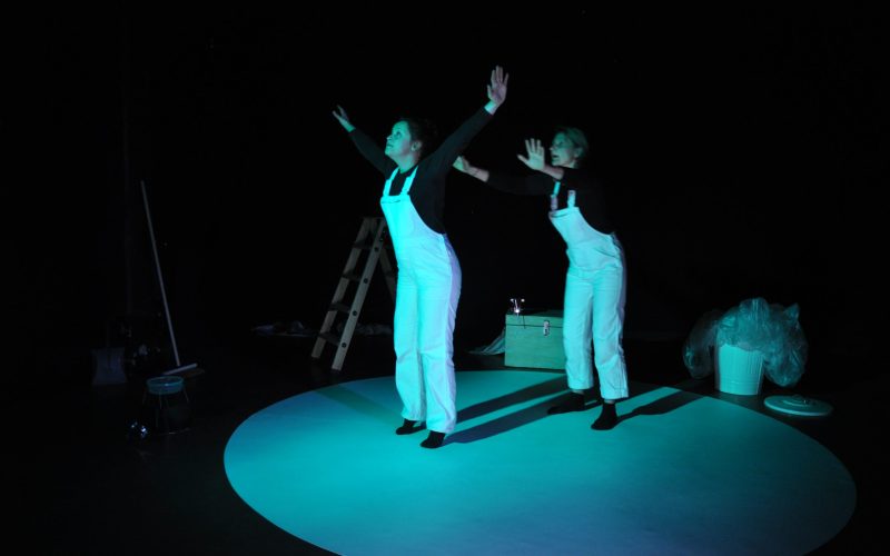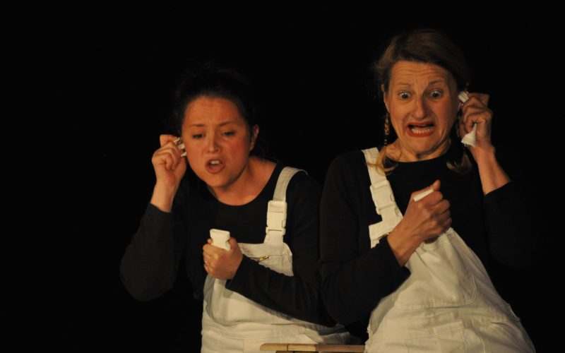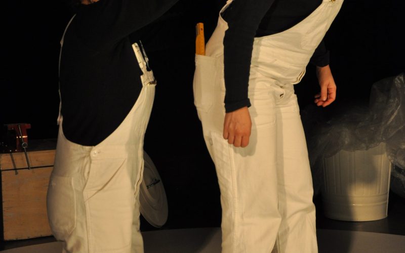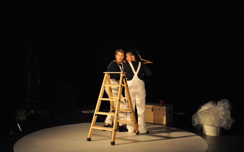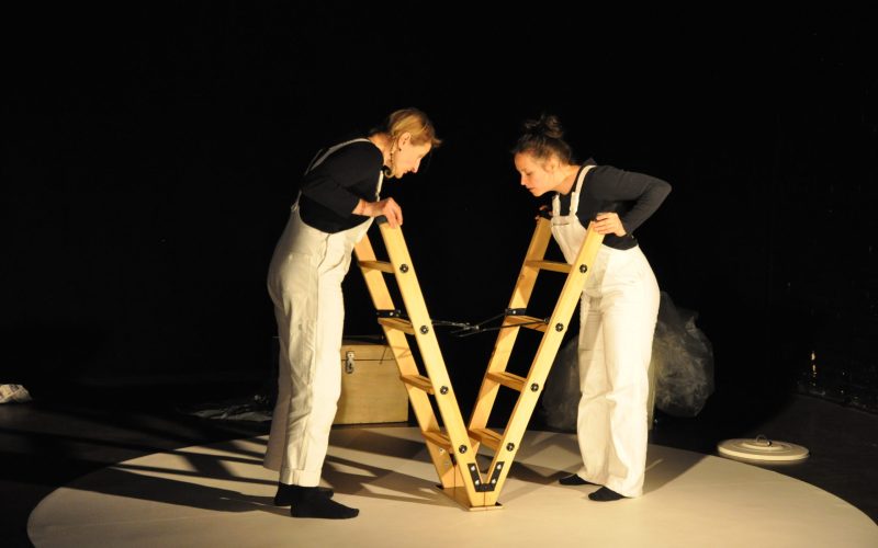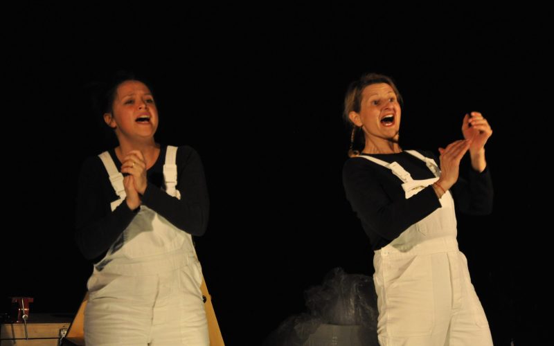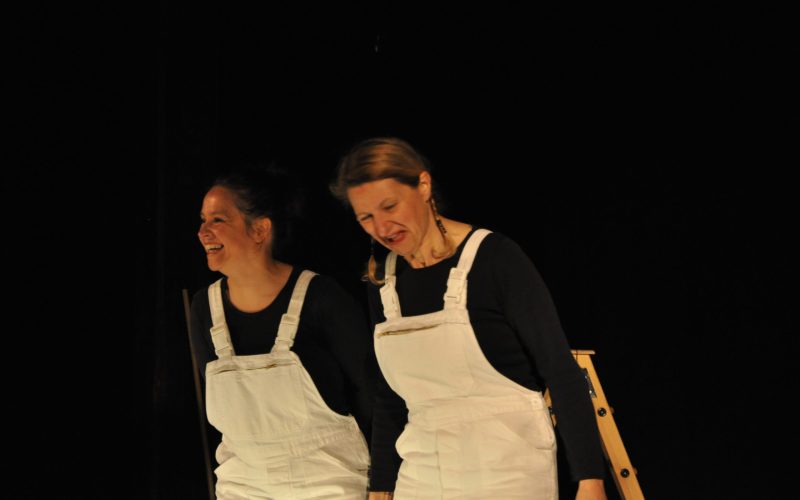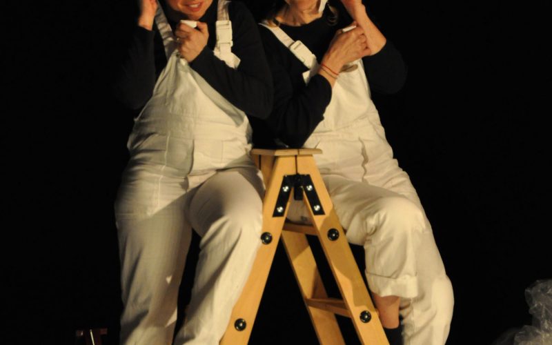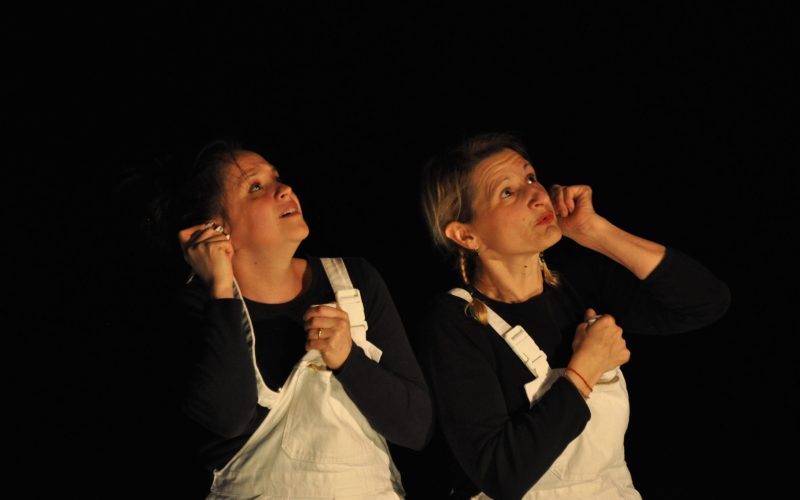 Sur scène, un vrai chantier, et deux conteuses-bricoleuses. Elles ont l’imagination à fleur de bouche, la fantaisie sur le bout de la peau et la lune sous leurs pieds.